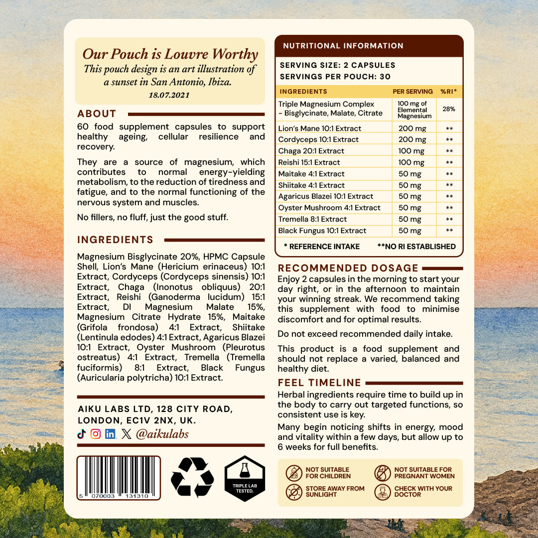 - Longevity combines a comprehensive 10-mushroom complex with triple magnesium (Malate, Citrate, Bisglycinate) to rebuild what chronic stress and exhaustion have depleted.